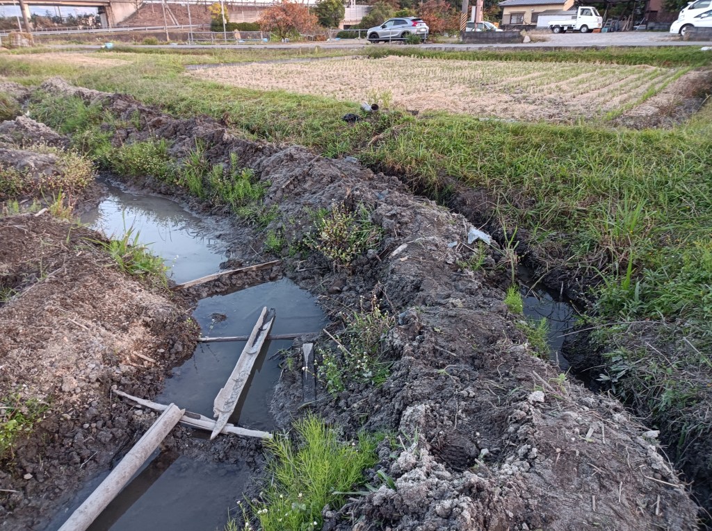 1日に降った雨で畑の半分が水没する状況に。次の2週間で水を抜いてそのあとは水の溜まる位置を移動させます。これを乗り越えれば畑作業が始められる!