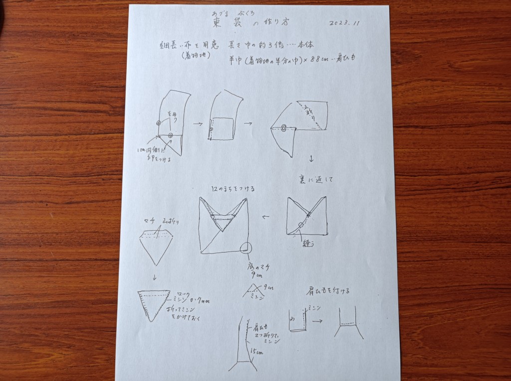 野菜配達用の袋としてあずま袋を作っています。買い物袋の日用使いも兼ねていています。三回目のあずま袋づくりでようやく、布の折り方がわかったので図面をおこします。便利な袋なので裁縫に挑戦してみてください。輪づくりでは、月に一回、裁縫のモノづくりを行っています。(日程調整可)