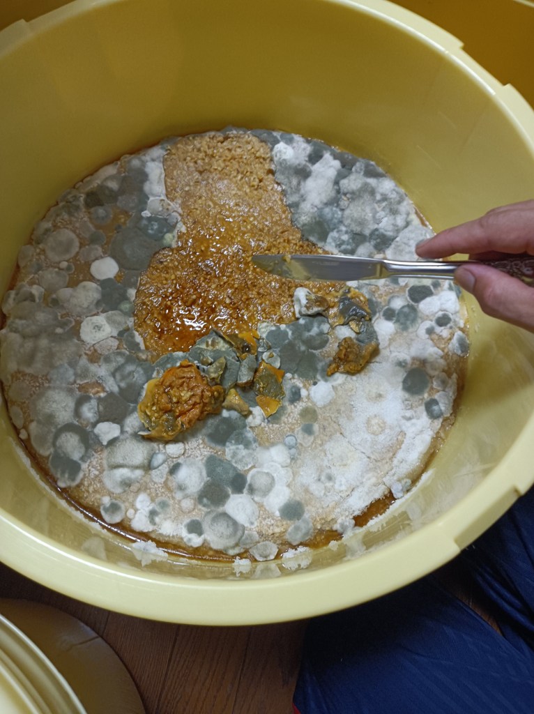 2023年の2月に集まりの共有財産、有事の際の非常食の主旨で100キロ相当の味噌を仕込みました。1年経ち、みその天地返しを行いました。一年寝かせた味噌の様子をご覧ください。