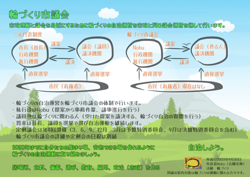 3月は予算特別委員会を含め、輪づくり市議会3月定例会を開きます。自分たちの市の予算はどうなっているのかを知るため、予算提案を議論するための定例会です。私たちが集まり場を作り、維持していく運営方法を市町村自治に倣えて輪づくり市議会を立ち上げています。目的の一つは、自分たちの集まり場を自分たちで作っていく自治に関わる人みんなが意識を向けること。もう一つは、市町村自治(市政)の関心を深めるために輪づくり市(輪づくり市議会)を制定しました。輪づくり市では、二元代表制のもと、関わる人たちで自治に取り組んでいきます。