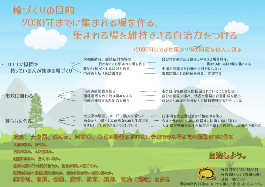 4.輪の自治を自分たちで行うこと(自分たちの暮らしの場を自分たちで作ること、ここには雇用、経済、政治運動、自治の共同作業が含まれる)
