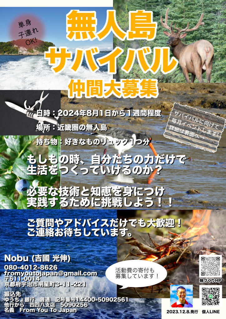 流しそうめんの準備は8月の無人島生活の準備を兼ねています。ナイフ工作で竹を切り、土台の角度調整などができるようになります。8月の無人島生活挑戦者も募集中です。